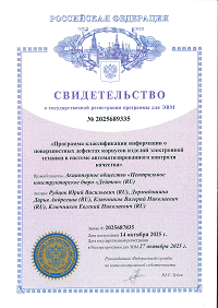 10. Свидетельство о государственной регистрации программы для ЭВМ "Программа классификации информации о поверхностных дефектах корпусов изделий электронной техники в системе автоматизированного контроля качества"